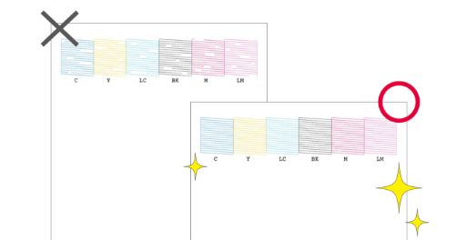 最終的に綺麗なべた塗が印刷できるようになっていればクリーニング完了です。
