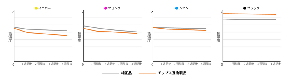 インクを使って印刷された写真は、空気中のオゾンに触れたり、日光に当たることでじわじわと色があせます。純正品、HDカラー®の色あせ具合を測定。ブラックは純正品よりも高濃度をキープ、CMYは従来の互換品と比べ極めて純正品に近い高耐色です。