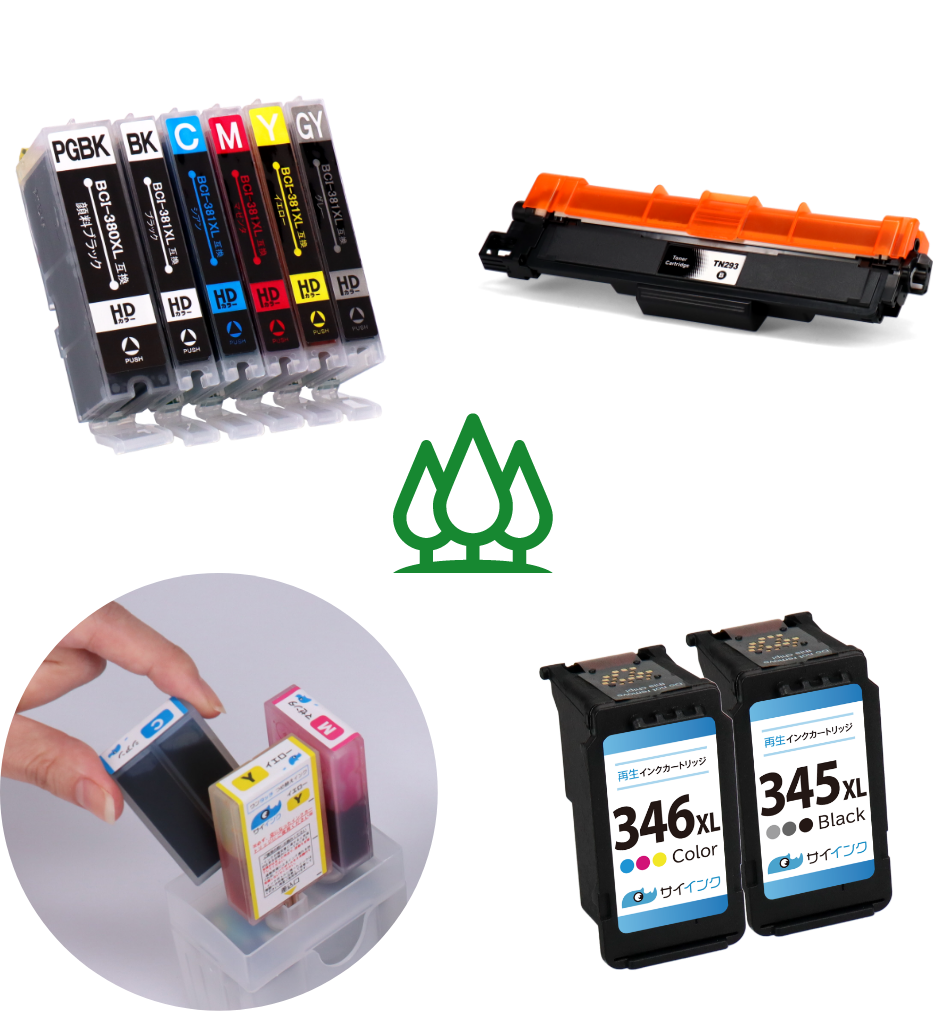 使用済み純正カートリッジを丁寧に分解・洗浄をおこないリサイクルする事で廃棄物を削減できる「再生カートリッジ」、その他にも空になった