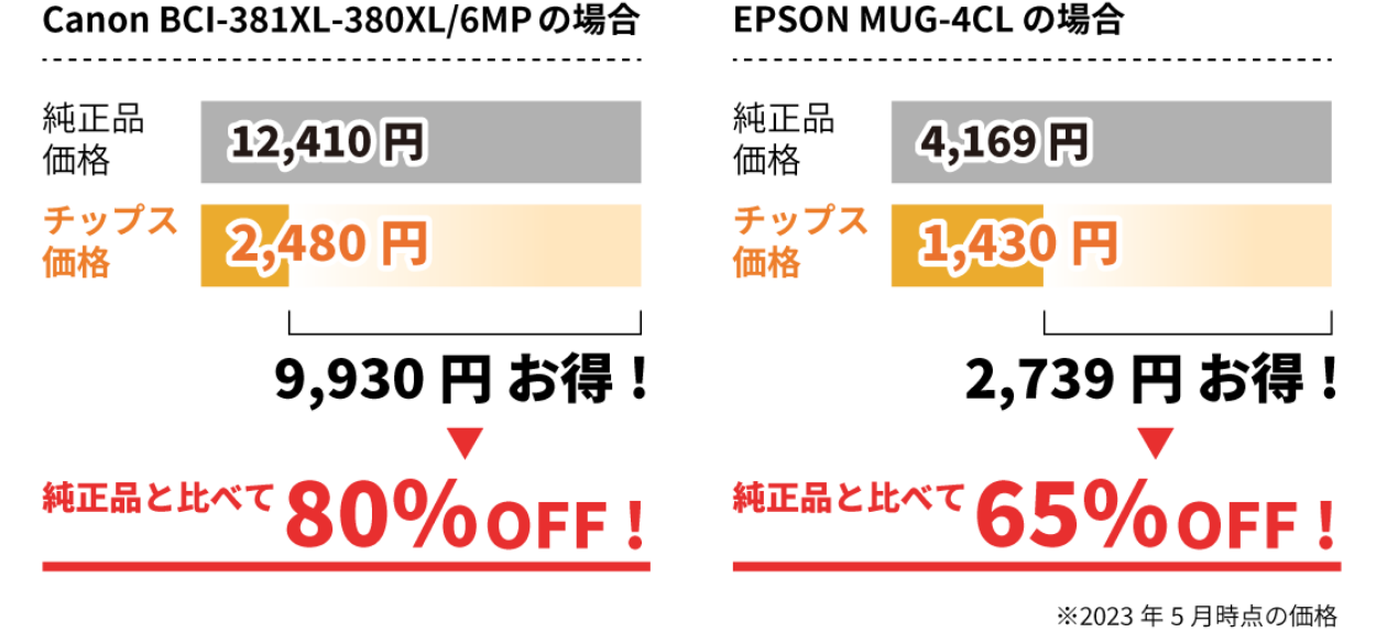 チップスのインク・トナーは、全て海外生産・コンテナ単位で仕入れており、さらにプリンターの開発費用やランニングコストが価格に含まれていません。その為、純正品には実現不可能なお値段でご提供できるのです!