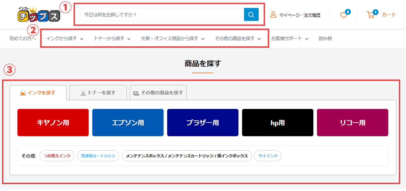 お客様に合った検索方法を①~③の、いずれかの方法で商品をお探しください。