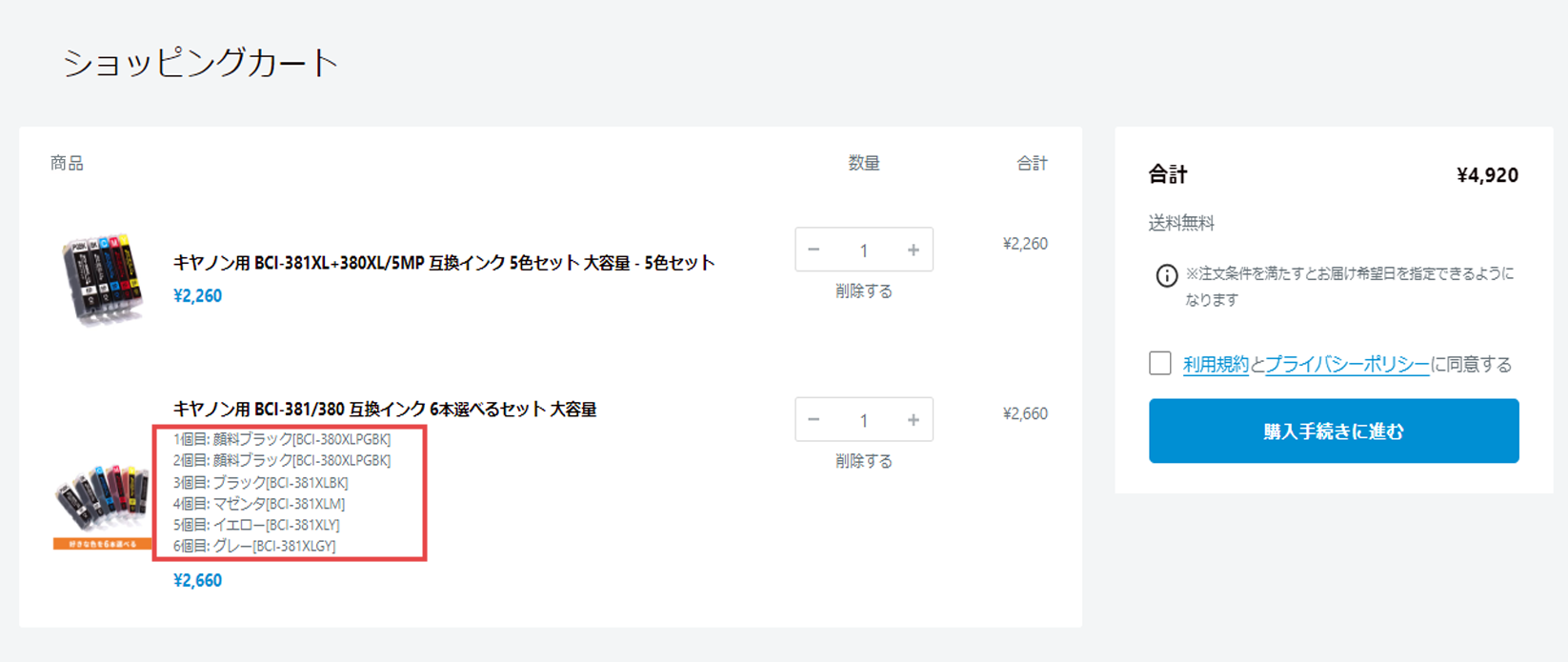 ※好きな色を選べるセットをご注文のお客様は、赤で囲んでいる部分に選んだカラーが記載されているかご確認ください。記載がない場合は色が選べていないため、カートの中の商品を一度削除し、商品ページへ戻って色を選択しなおしてください。