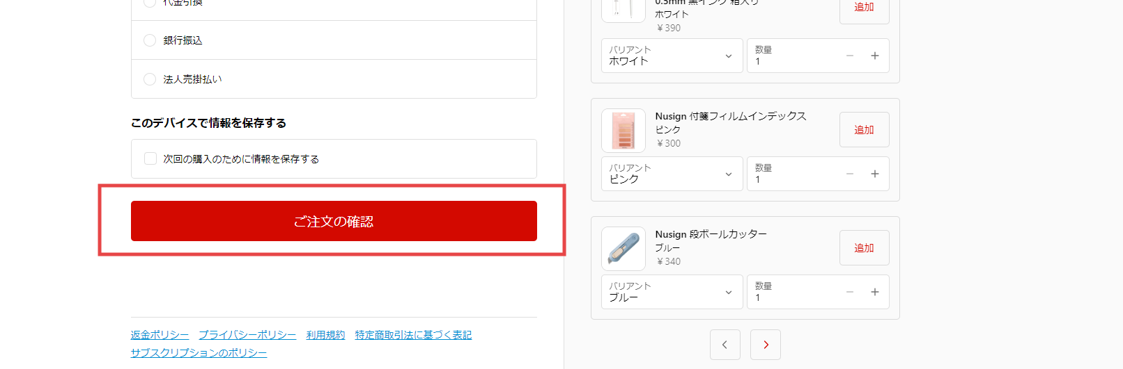 ショッピングカート内の商品・金額に間違いがないか確認してください。