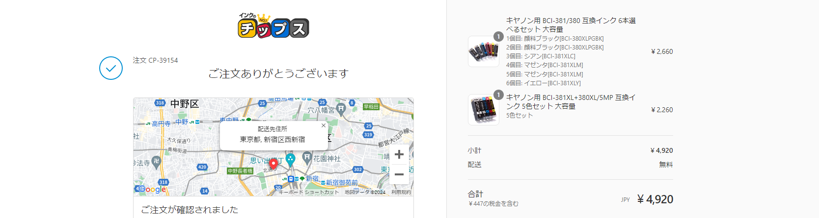 注文が完了し、確定した内容が表示されます。