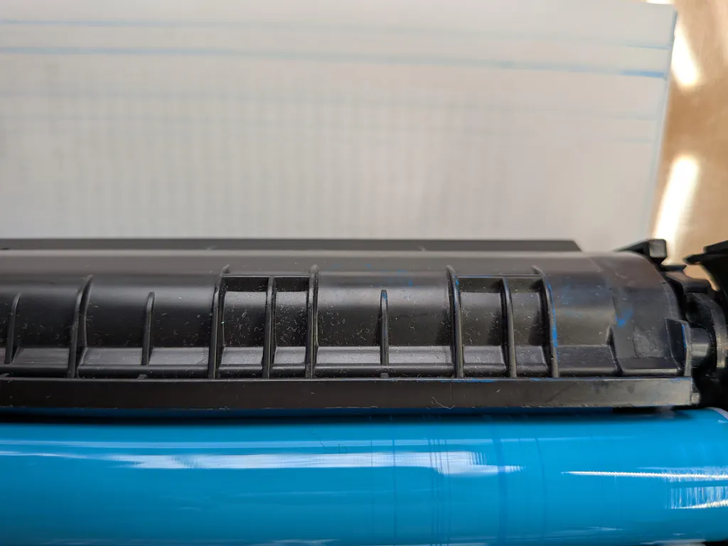 キャノン用CRG-054H互換トナーを使用しています。当初は問題なかったのですが最近、写真の様にトナーのドラム(青いところ)面に何本かのスジが入り、印刷面(上部の白い紙面に青いスジが)にも入ってしまいます。シアン程ではないですが、黒にも入ります。