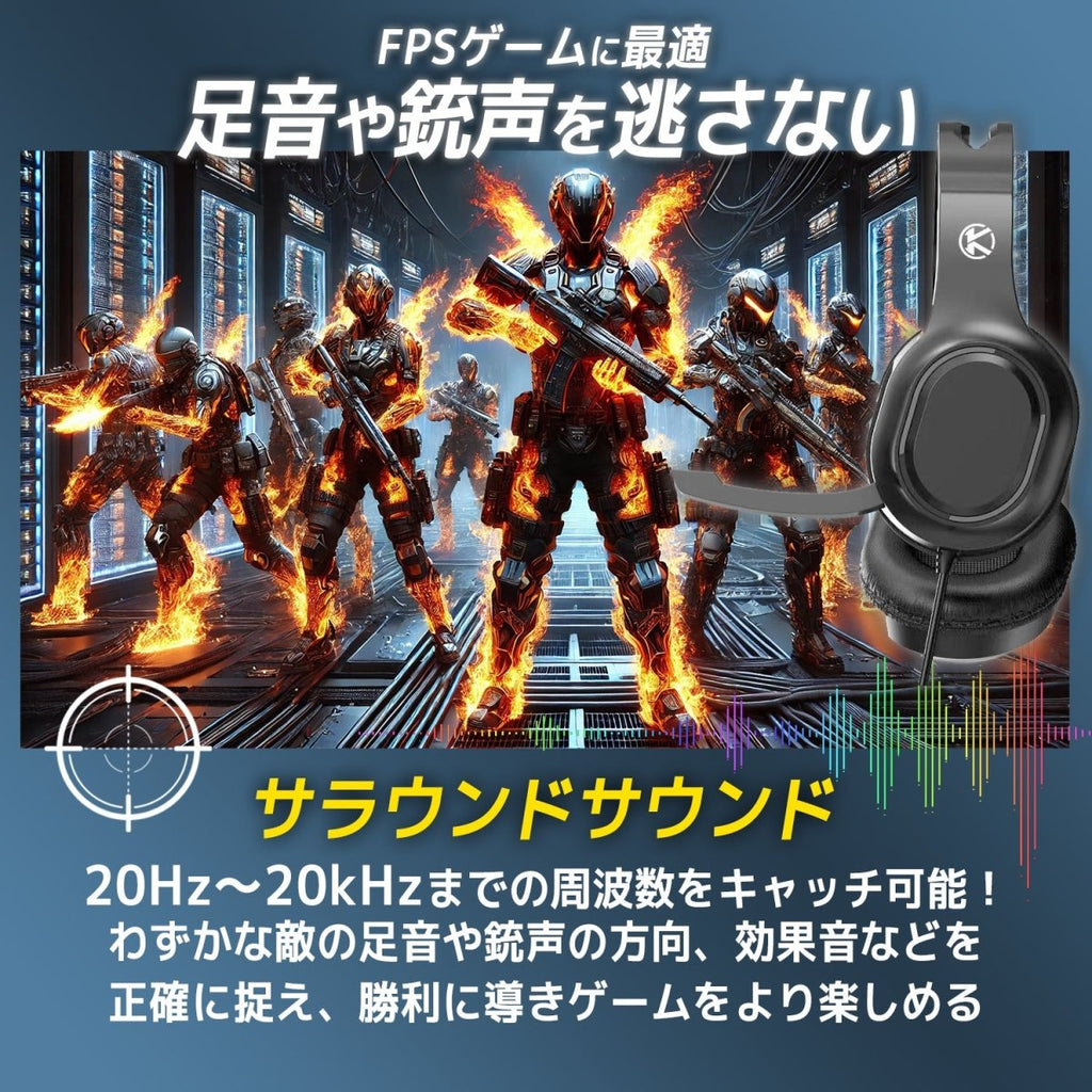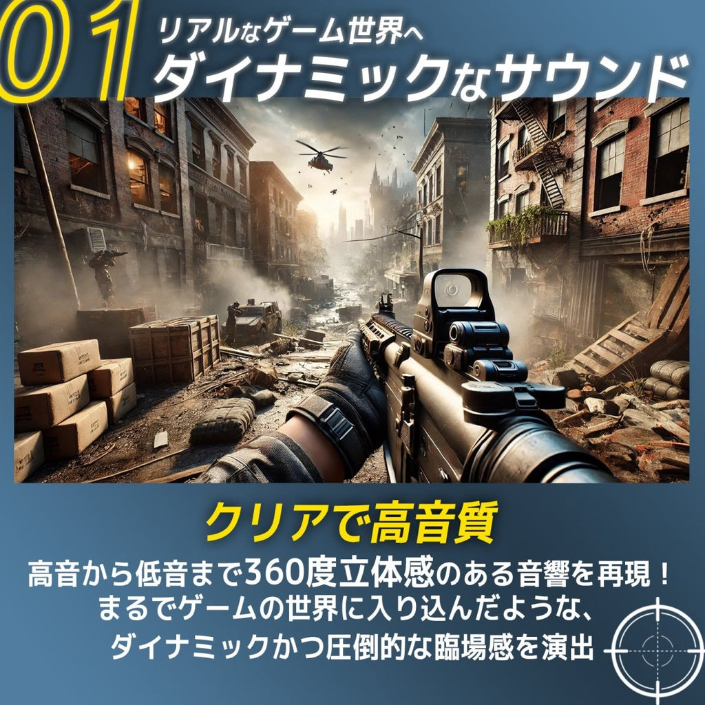 • 本製品はサラウンド機能を搭載しており、音が全方位から聞こえるような立体感のある音響をお楽しみいただけます。特にゲームプレイ中では、足音や銃声の方向を正確に捉えやすく、より臨場感あふれるゲーム体験を実現します。