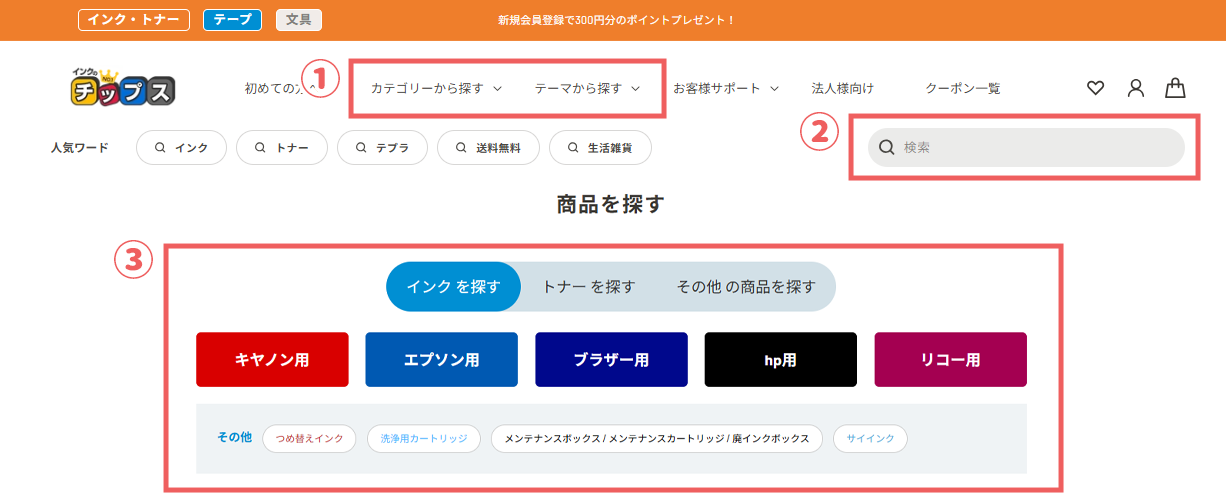 お客様に合った検索方法を①~③の、いずれかの方法で商品をお探しください。