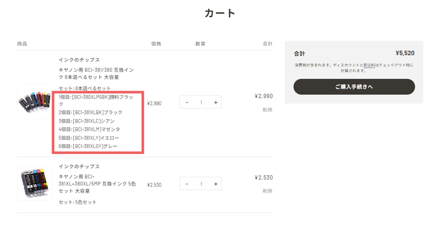 ※好きな色を選べるセットをご注文のお客様は、赤で囲んでいる部分に選んだカラーが記載されているかご確認ください。記載がない場合は色が選べていないため、カートの中の商品を一度削除し、商品ページへ戻って色を選択しなおしてください。